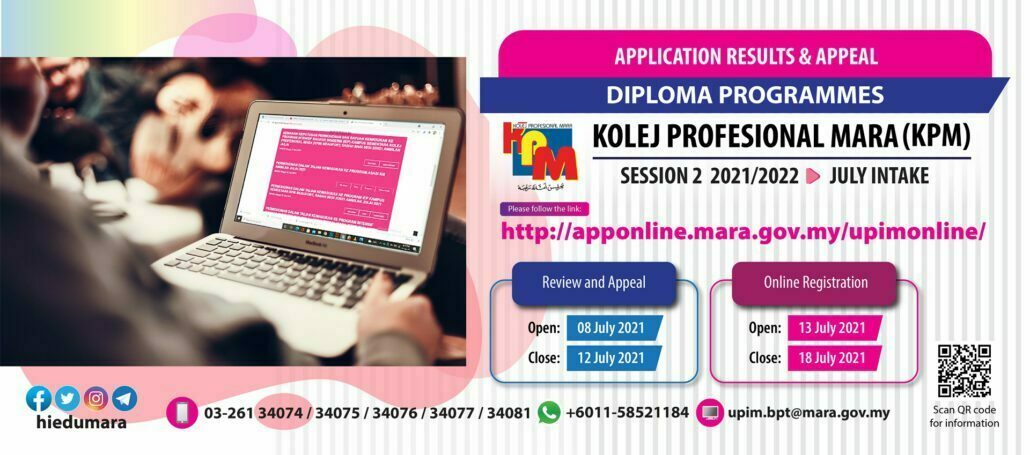 Application Results & Appeal of Kolej Profesional MARA (KPM) Diploma Programmes 2 2021/2022 Session July Intake