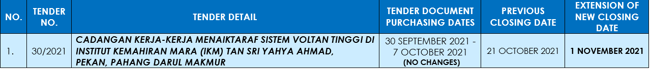EXTENSION OF CLOSING DATE FOR TENDER CADANGAN MEMBINA DAN MENYIAPKAN MAKTAB RENDAH SAINS MARA (MRSM) KETEREH, DI ATAS TANAH LOT 3689, MUKIM PERINGAT, DAERAH PERINGAT, JAJAHAN KOTA BHARU, KELANTAN DARUL NAIM (TENDER 33/2021)