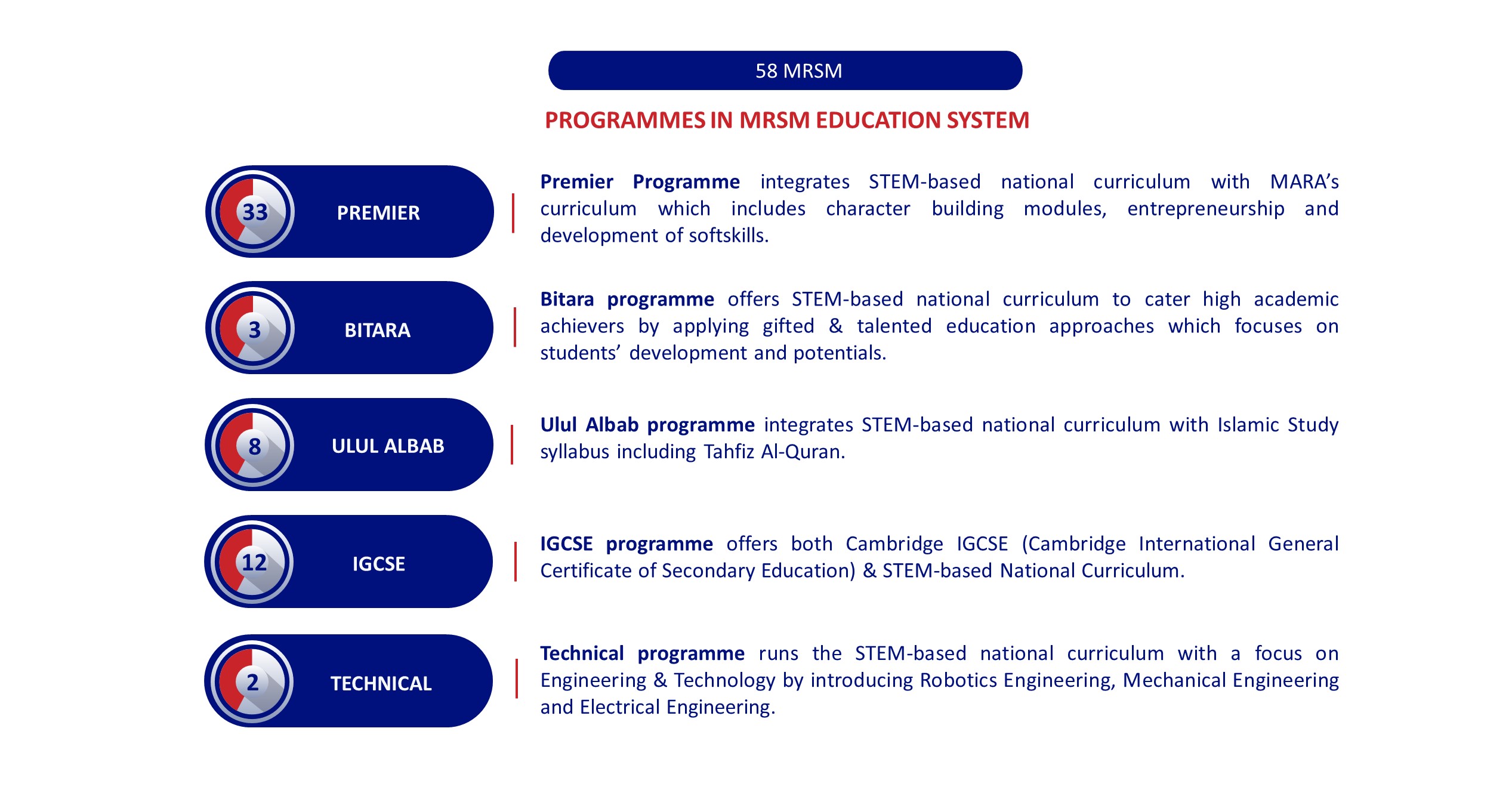 There are five programs based on science, technology, engineering, and mathematics (STEM) implemented at MRSM, as follows: