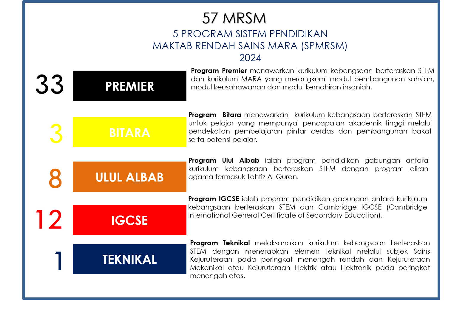 The MRSM education system is streamed according to five programmes in the fields of Science, Technology, Religion, Engineering, Arts and Mathematics (STREAM):