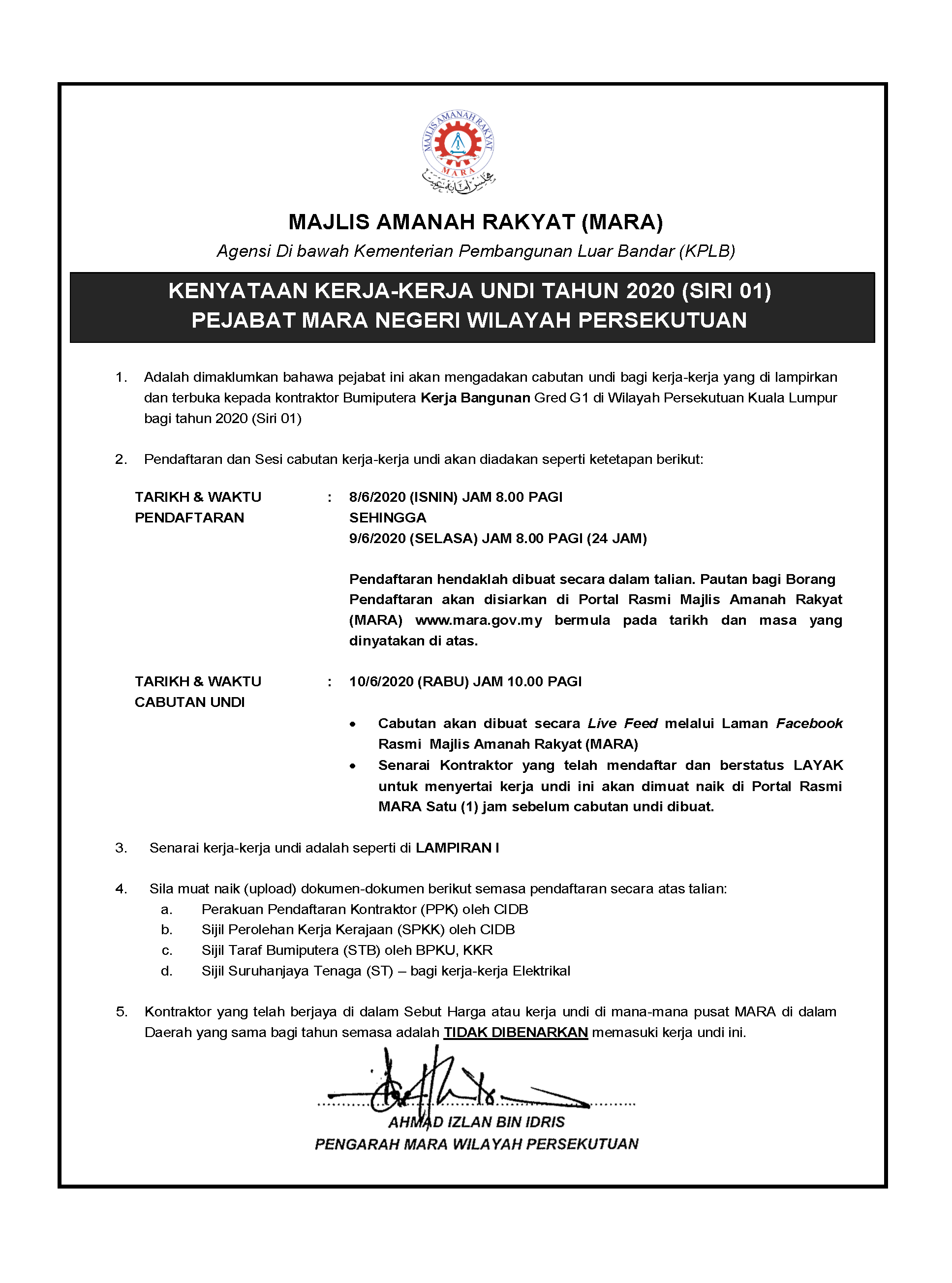 | BIL | KERJA-KERJA UNDI SIRI 01 | SENARAI PROJEK | STATUS PENDAFTARAN KONTRAKTOR |