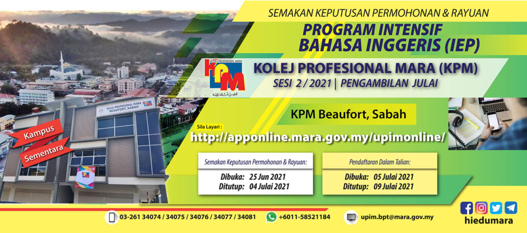 Semakan Keputusan Permohonan & Rayuan Kemasukan ke Program Intensif Bahasa Inggeris (IEP) Kampus Sementara Kolej Profesional MARA (KPM) Beaufort Sabah Sesi 2/2021 Pengambilan Julai